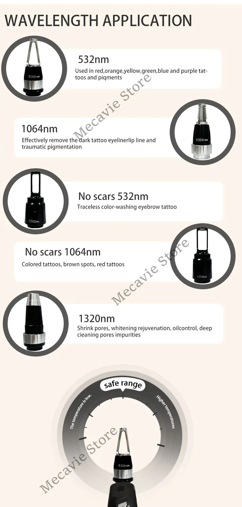 The picosecond Nd:YAG module uses ultra short pulses to shatter tattoo ink and deep pigment into fine particles. Wavelengths such as 1064nm and 532nm, with optional 585nm, 650nm or 755nm tips, target black, dark inks and stubborn colors. Picosecond scale pulses deliver high peak power with lower thermal spread compared with older nanosecond systems. This helps reduce risk of collateral heat damage while still breaking up ink granules effectively. Clinics can use this handle for multi color tattoo removal, eyebrow correction, pigment spots and melasma management under proper indications.