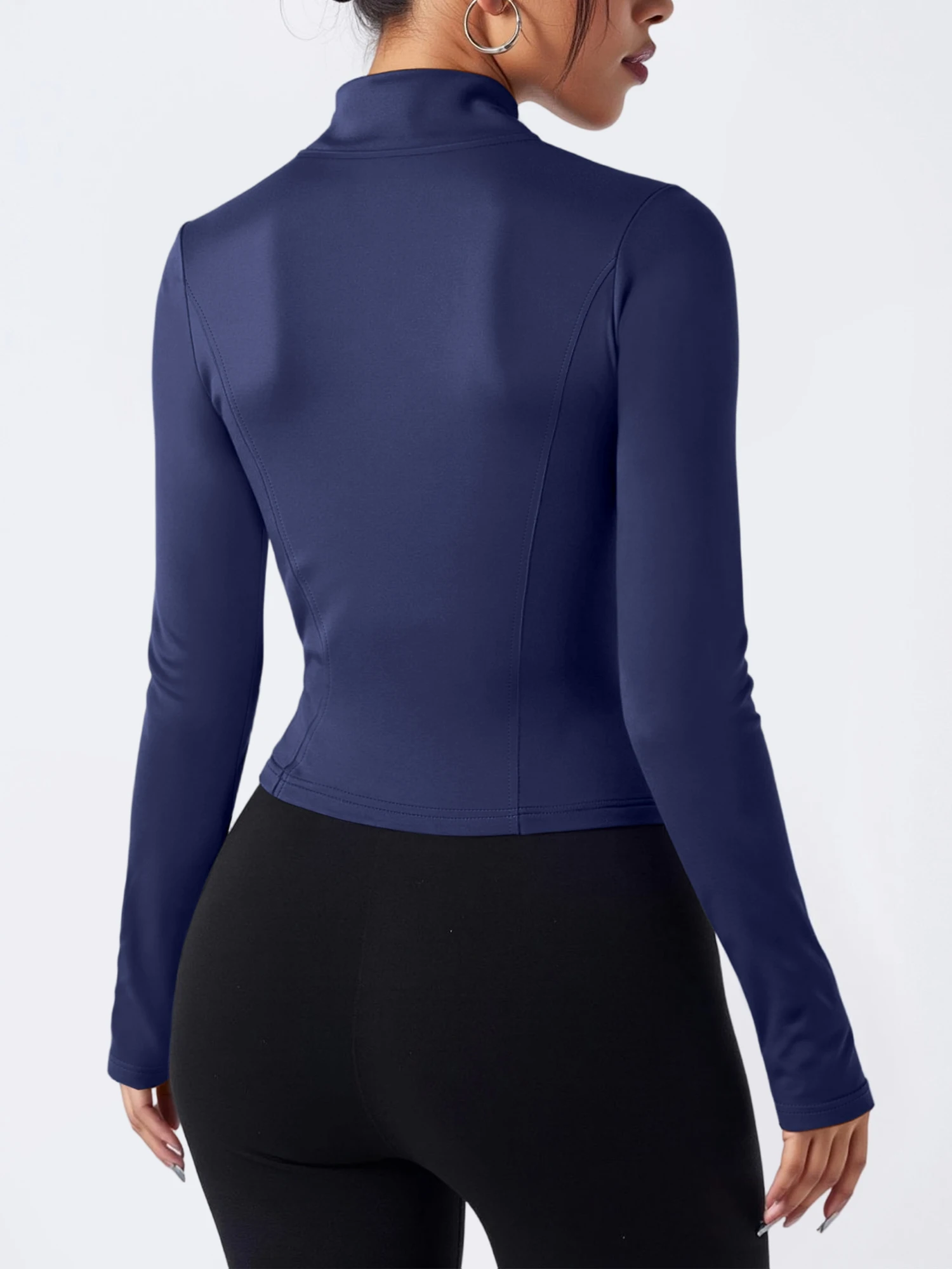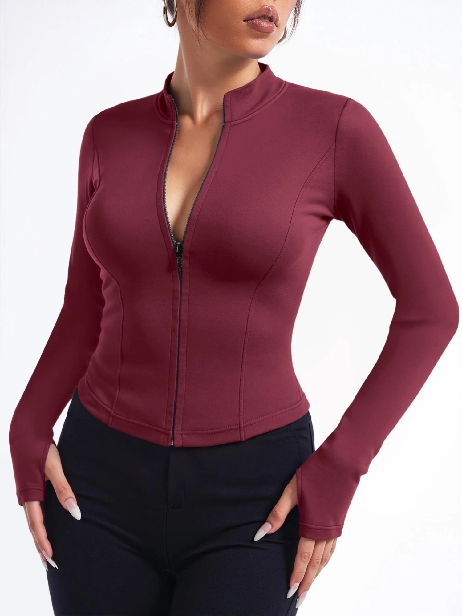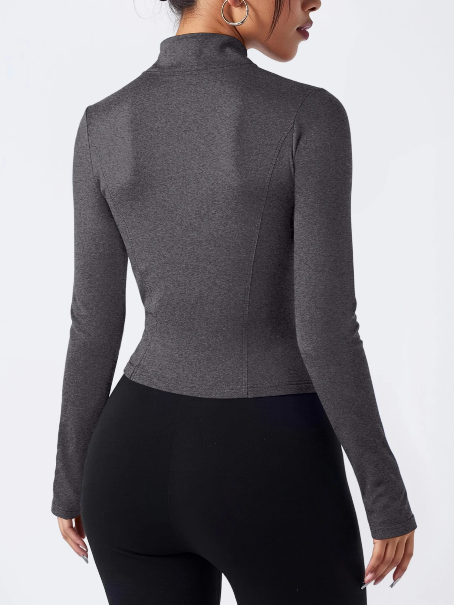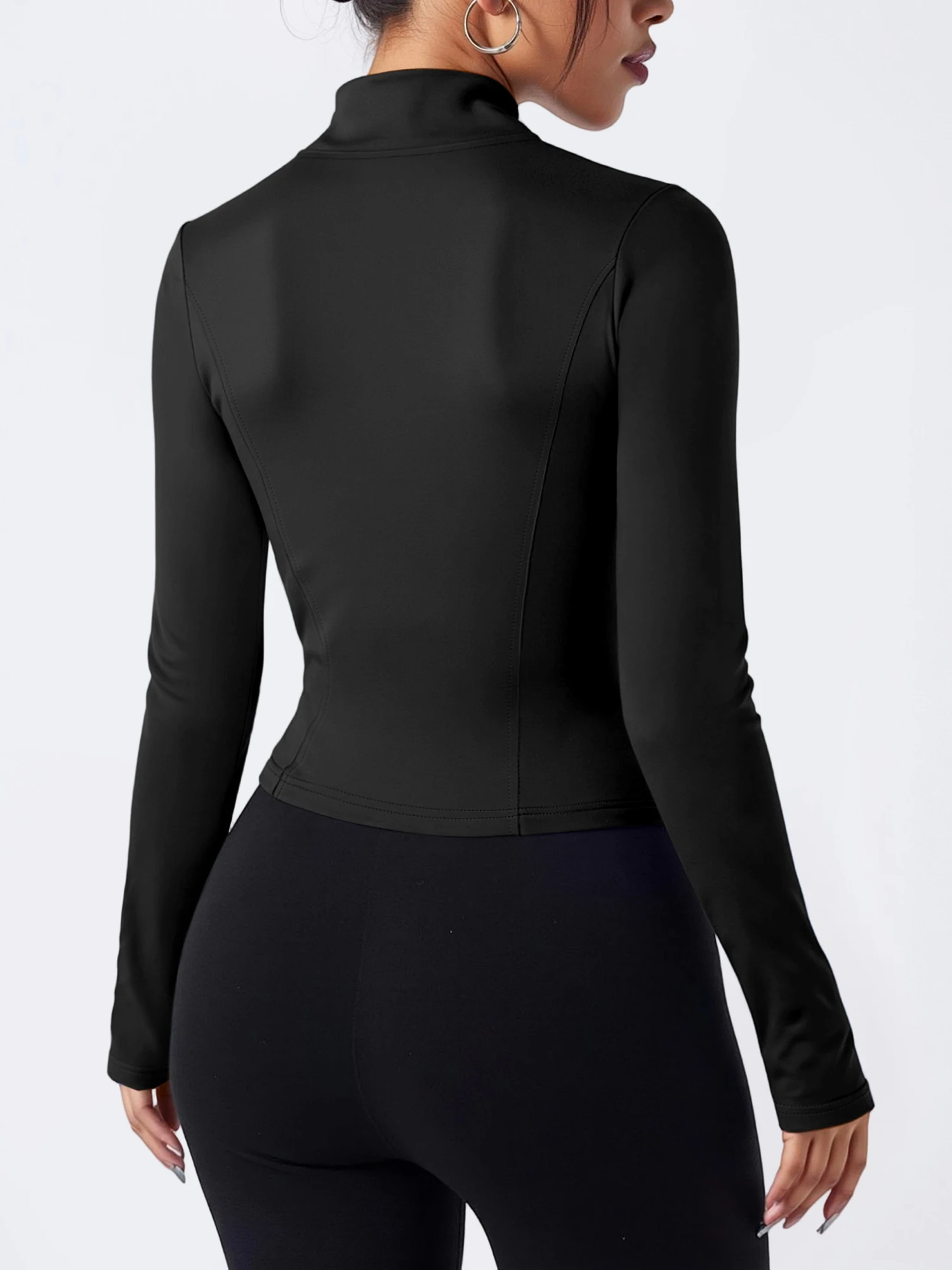 Several design elements support a slimming look. The slim fit traces the body without extra fabric. The cropped length draws attention to the upper waist. The vertical line of the zipper elongates the torso. The stand collar adds height at the neckline. High elastic fabric smooths the surface for a neat finish. Long sleeves create a continuous line along the arms. When combined, these elements can create a more defined outline. The result feels both comfortable and visually refined.