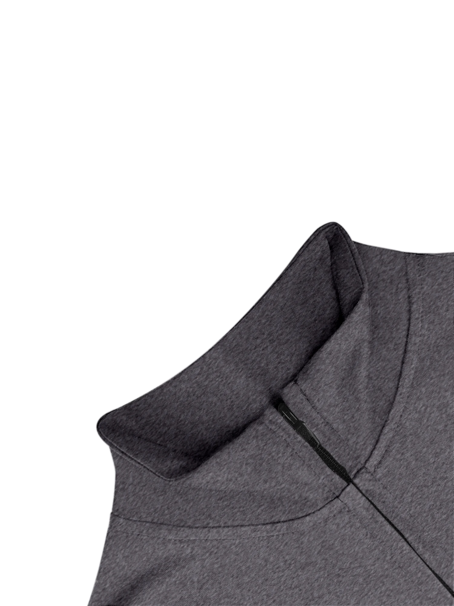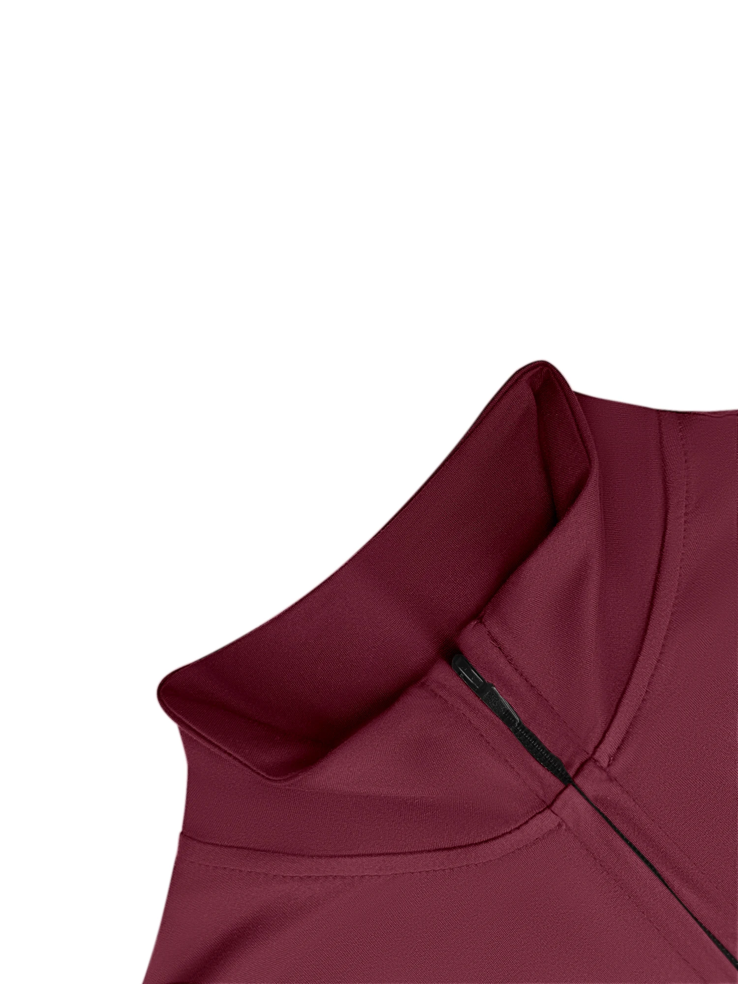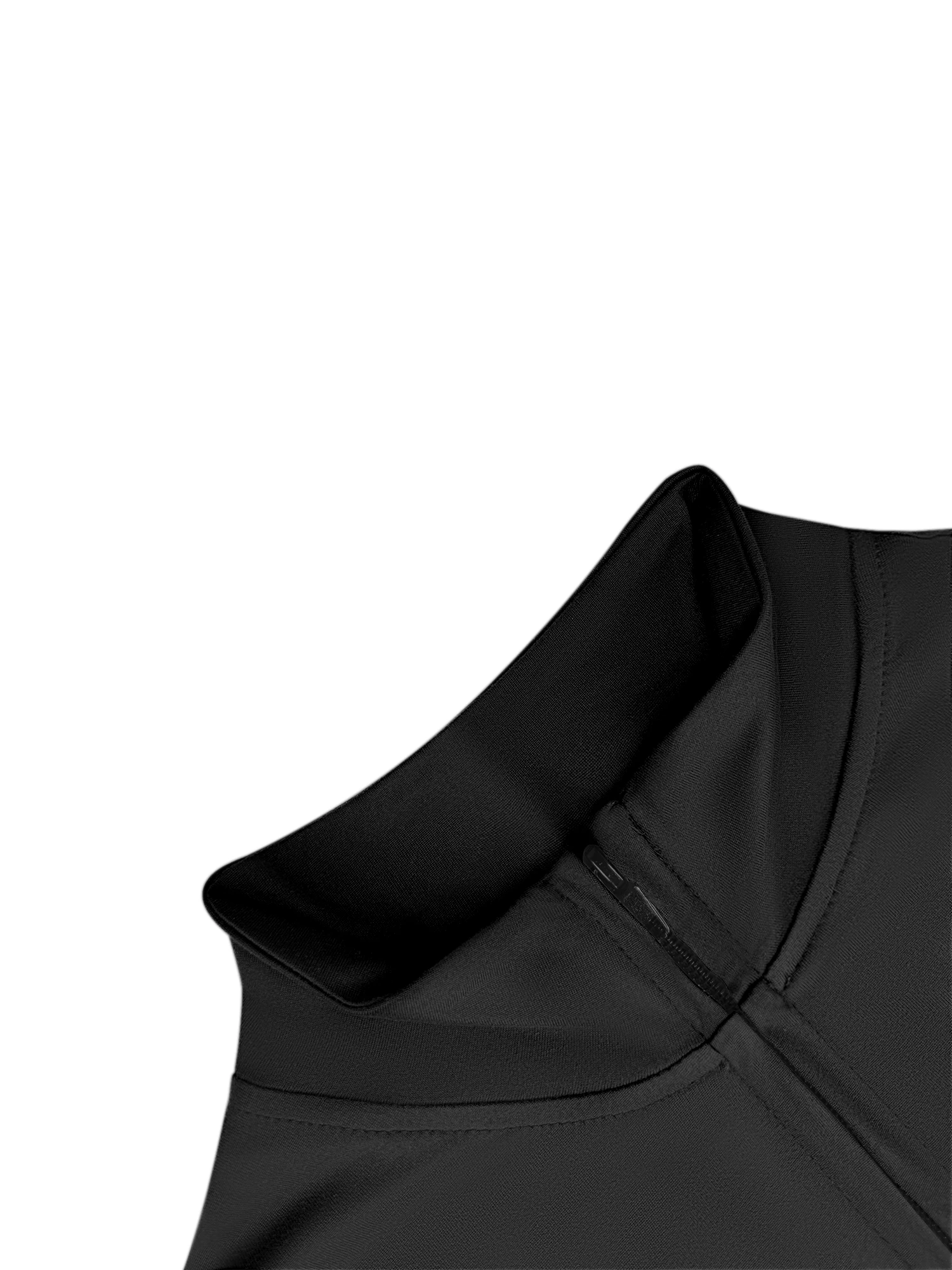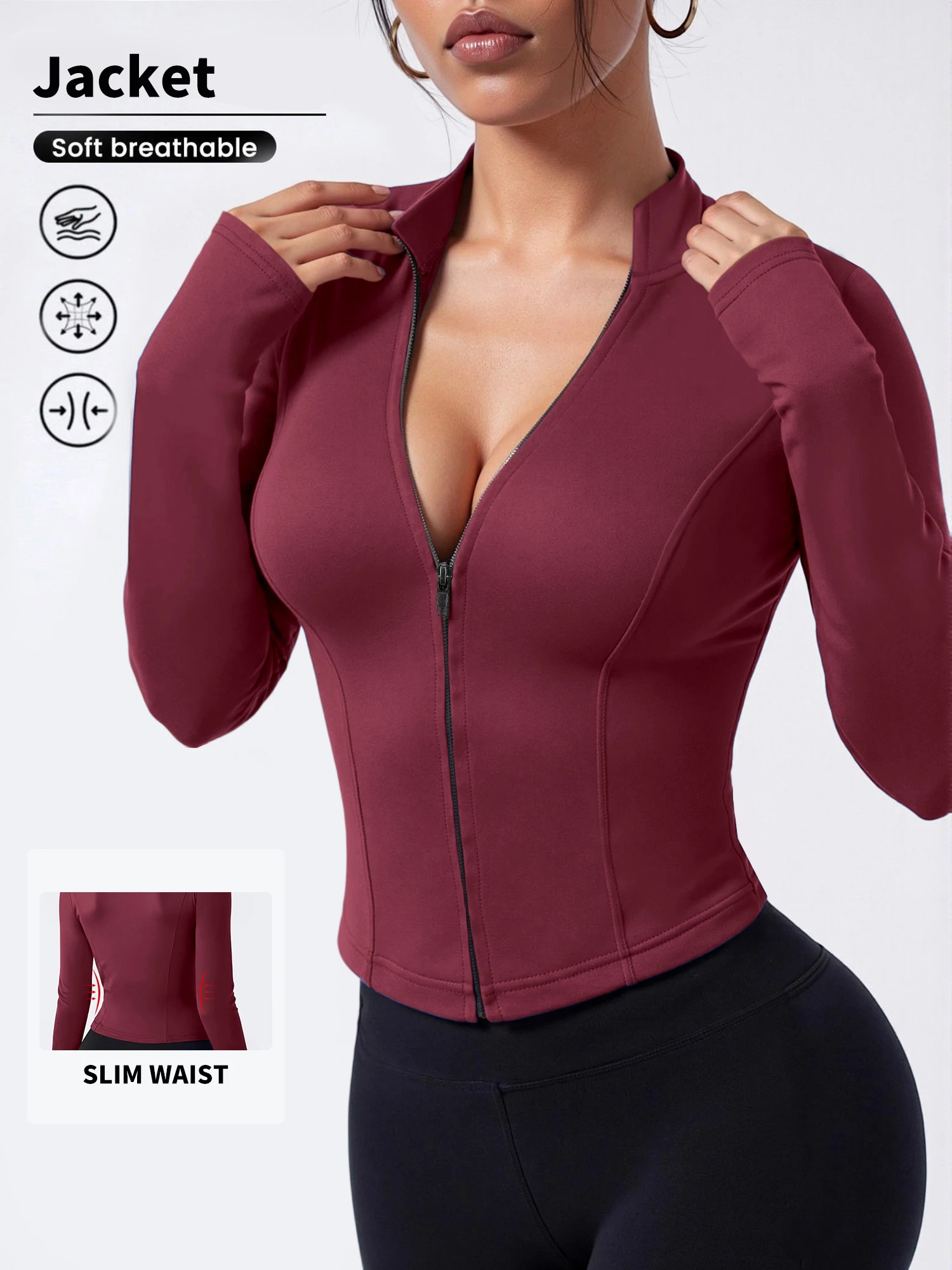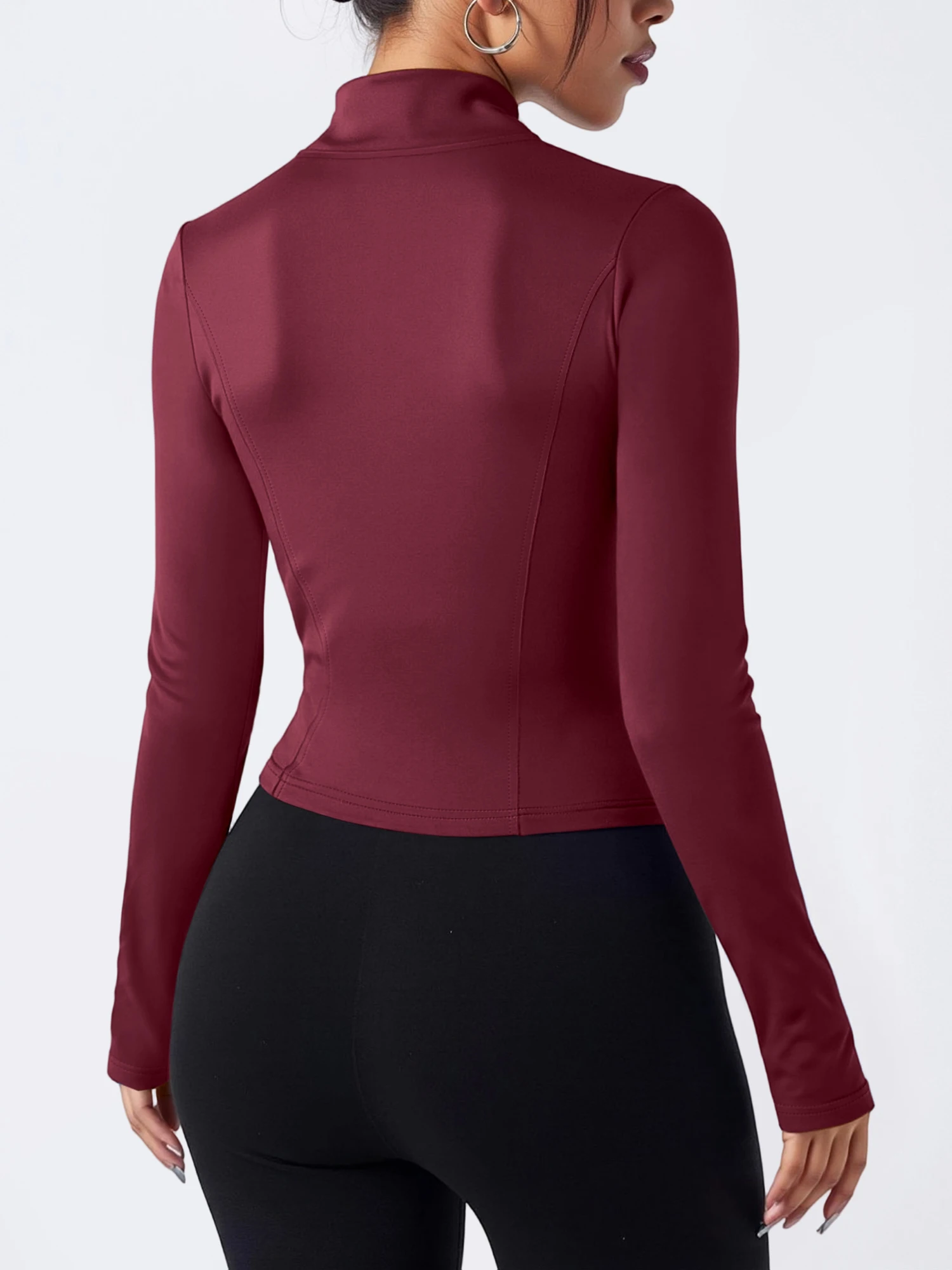 Several design elements support a slimming look. The slim fit traces the body without extra fabric. The cropped length draws attention to the upper waist. The vertical line of the zipper elongates the torso. The stand collar adds height at the neckline. High elastic fabric smooths the surface for a neat finish. Long sleeves create a continuous line along the arms. When combined, these elements can create a more defined outline. The result feels both comfortable and visually refined.