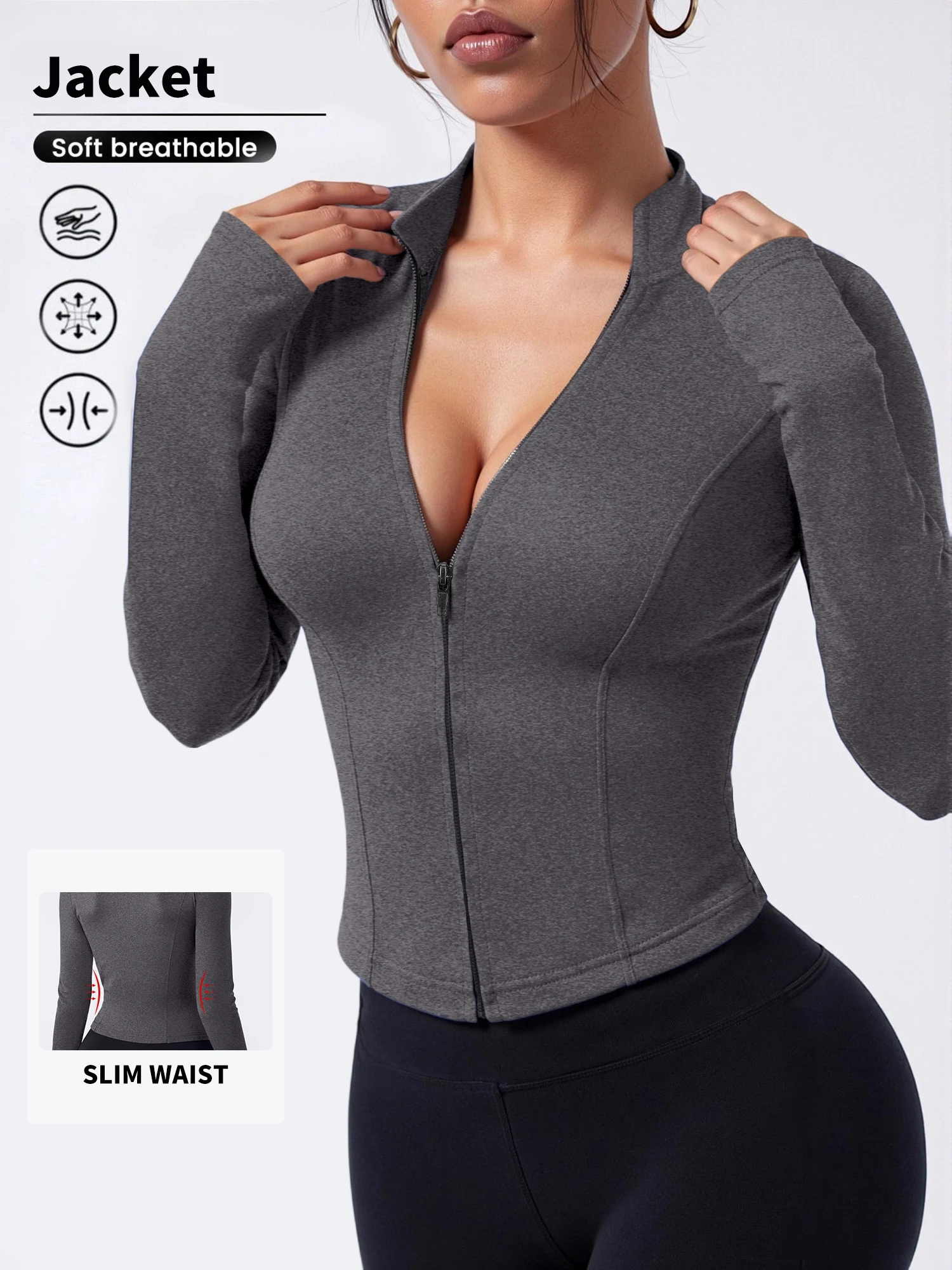 Long sleeves complete the slim fit effect. The sleeves follow the natural shape of the arms. The high elastic fabric helps smooth minor lines. A close fit can create a sleek look from shoulder to wrist. The cuffs sit neatly at the wrist without bulk. The design works well under coats or blazers. The simple sleeve style keeps the focus on the silhouette. This structure makes the jacket feel suitable for both casual and slightly dressier settings.