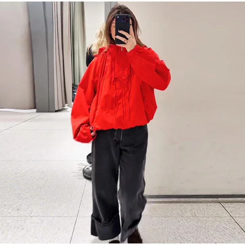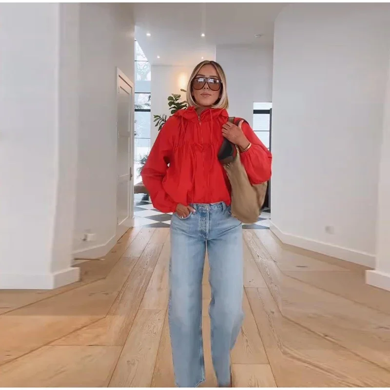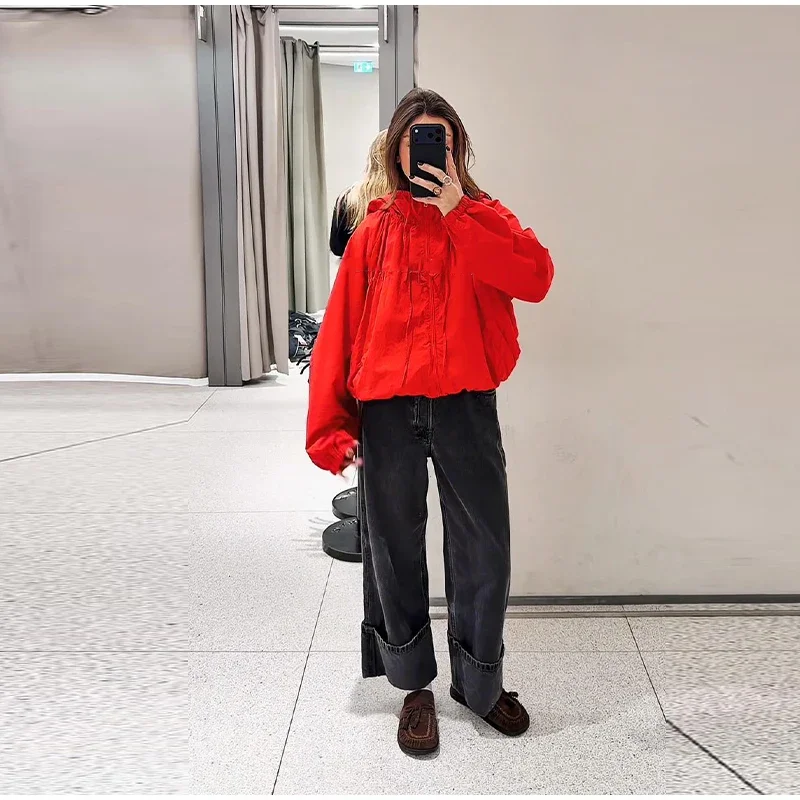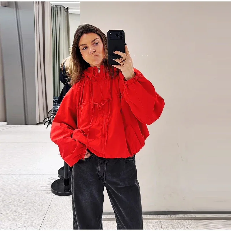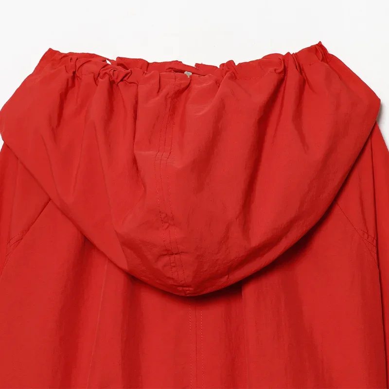 This women’s hooded jacket combines chic street style with 2026 spring fashion through its loose silhouette and thoughtful detailing. Full sleeves offer coverage while the stand collar frames the neckline cleanly for a structured yet relaxed look. Multiple zippers add functional style points that elevate basic outerwear into fashion-forward territory.