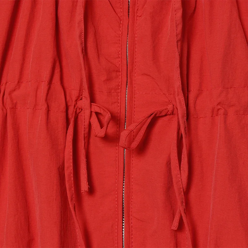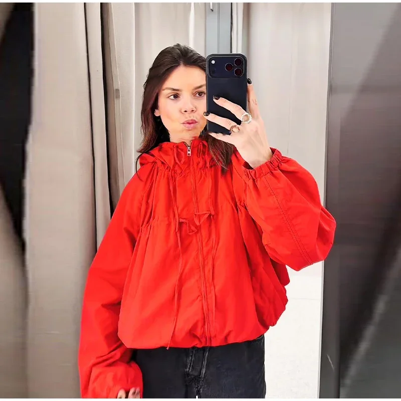 Designed specifically for spring weather, this jacket bridges cool mornings and warmer afternoons through breathable fabric and adjustable features. The hooded design protects against light rain while lace-up detailing allows ventilation control. Perfect outerwear companion for jeans, skirts, cargos, or athleisure bottoms.