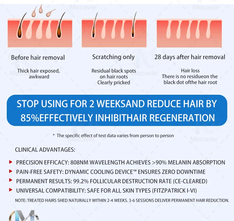 This machine supports professional treatment plans for both male and female clients. Men can treat chest, back, shoulders, neck and beard line to cut down daily shaving. Women often focus on legs, arms, underarms, bikini line and facial areas below the cheek line. Wider wavelength coverage helps handle thick terminal hair and finer vellus hair with the same platform. Full body packages become simpler to deliver when one device handles every zone. As hair growth softens, grooming routines grow faster and more convenient at home.