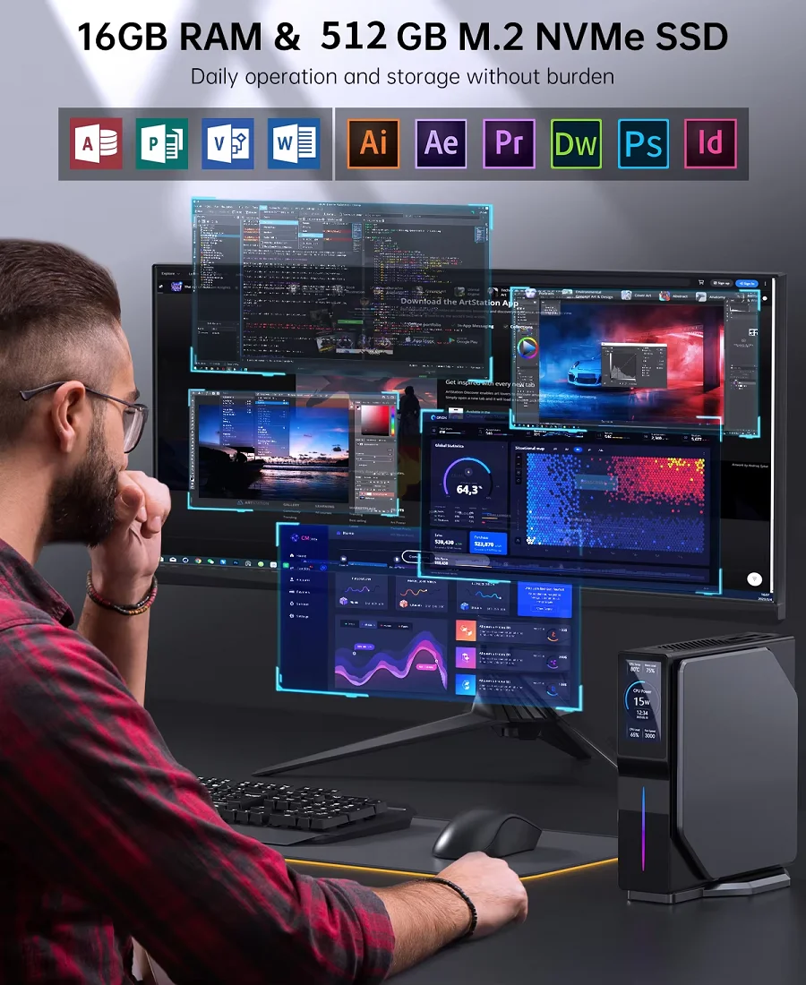 Users who need a compact, visually interesting machine will appreciate the combination of the vertical mini tower form factor and the integrated LCD screen. Apartments, dorms, and mobile workstations gain a capable PC that can sit beside a monitor or even behind it using VESA mounting in some designs. Office deployments benefit from low energy use, quiet operation, and simple cable routing. Overall, this Intel 12th Gen Alder Lake N150 Mini PC delivers solid everyday performance and light gaming in a tidy, modern package.