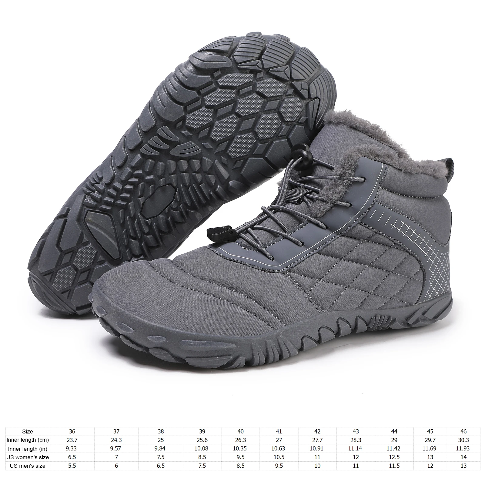 Barefoot Comfort Meets Winter WarmthThese Plus Size Barefoot Hiking Boots combine a zero-drop, flexible sole with thermal insulation, creating a minimalist feel that still keeps feet warm in cold weather. Designed for both men and women, the ankle bootie profile offers natural foot movement while protecting against rough terrain. Plush Fleece-Lined InteriorA thick faux-fur fleece lining wraps the entire foot and ankle for cozy insulation. This soft lining locks in heat while remaining gentle on the skin, making the boots ideal for everyday winter wear and chilly hikes. Barefoot-Style Flexible SoleThe low-profile, bendable outsole allows toes to splay naturally and promotes a more grounded walking experience. Despite the minimalist feel, the sole provides enough cushioning for light hiking trails and casual city walking. Anti-Slip Outdoor TractionA rubber outsole with multidirectional lugs delivers improved grip on wet sidewalks, light snow, and uneven paths. This anti-slip design helps reduce the risk of slips during winter commutes or outdoor adventures. Plus Size Unisex FitAvailable in extended sizing to accommodate wide feet and larger sizes, the boots suit both men and women seeking barefoot-style winter footwear. The lace-up or slip-on design (depending on variant) allows fine-tuned adjustment over thicker socks. Casual Sneaker-Inspired StyleWith a sporty, sneaker-like silhouette, these ankle booties pair easily with jeans, leggings, or hiking pants. Their casual look makes them suitable for daily errands, travel, or post-gym wear in colder weather.