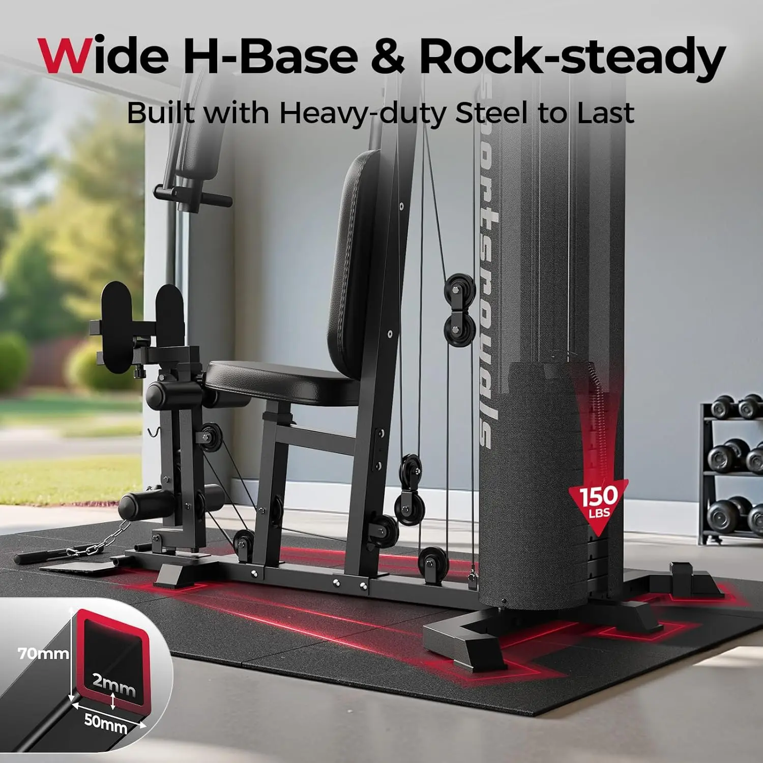 【Smooth Pulley System】150LBS weight stacks are waterproof and rust-proof, and easily switch weights to cater to your evolving strength levels. Experience smooth operation with the steel shaft pulleys and high-strength wire rope, ensuring quietness and safety.
