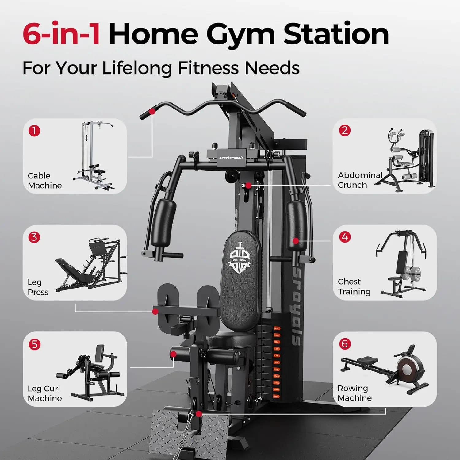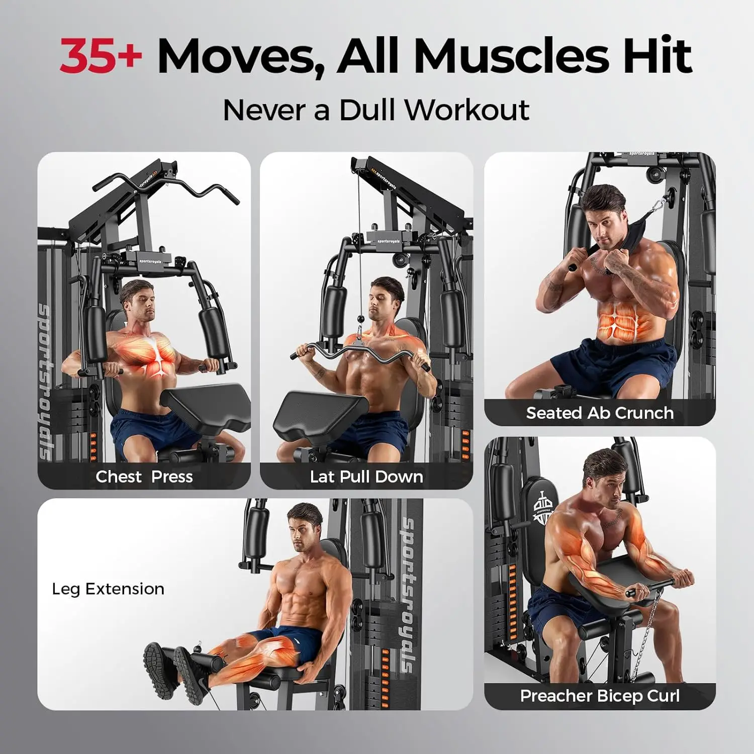 This Sportsroyals home gym slams 150LBS weight stack through pulley wizardry, unleashing 30+ full-body assaults from chest-crushing presses to lat-lashing pulldowns in one space-smart siege engine. Commercial-grade steel laughs at wobbles while adjustable arms, seats, and curls tailor torment to your torso. Meanwhile, the compact footprint turns garages into gainz garages without remodeling regrets.