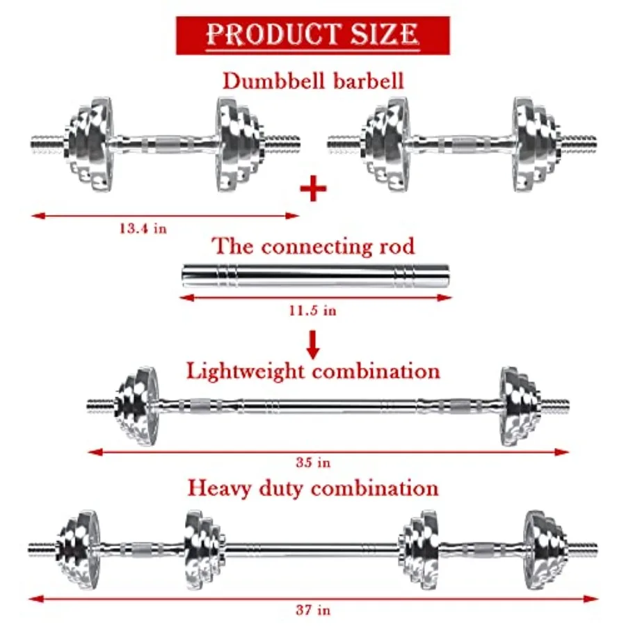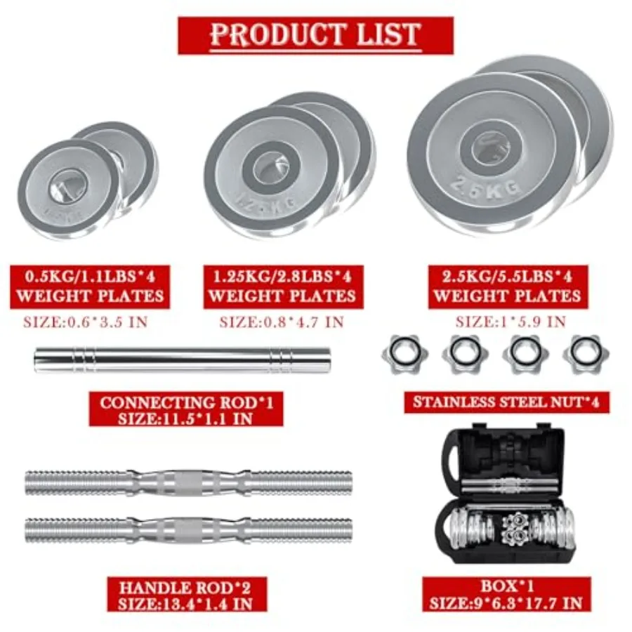 【Package List】- Package included 1x connector, 2x dumbbell bar, 4x nuts, 4 x 1.1-pound plates, 4 x 2.8-pound plates, 4 x 5.5-pound plates, 1 x exquisite gift box.